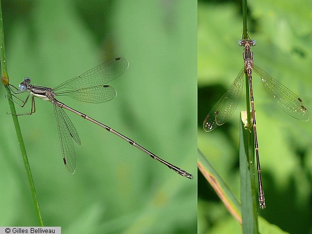 | This species can be readily identified with binoculars or the naked eye due to it's extremely long thin abdomen and relatively short wings (wings are only approximately half the length of the abdomen).   Also, the white edge at the tip of each wing is unique to this species among the spreadwings occuring in NB.   The shoulder stripes eventually become greenish-blue as the male matures. |