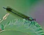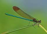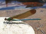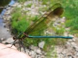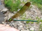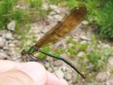 and is typically found along rivers, brooks and streams. The males have an irridescent green thorax and abdomen which can appear blue under certain conditions. The wings are typically tinted amber (though sometimes very pale) and the tip of the hindwings (1/4 to 1/5) is a darker amber colour than the rest of the wing. The females have a bronze to green thorax and abomen but are not as brilliantly coloured as the males. Their wings are also tinted amber but lack the darker tip on the hindwing and they have a white spot (the stigma) on the leading edge of their wings (near the tip) Note: the above photo of a female shows a darker tip on the wing but the wings were actually the same colour from base to tip.   The darker appearance in the photo was due to the darker background (green vegetation) behind the tip of the wings and had I noticed it at the time I was taking the photos, I would have adjusted for it.   You can also see a small darker spot about 1/3 of the way out on the wing caused by the same thing.
