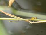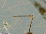there are orange forms of female Forktails (Ischuras) that look somewhat similar. Mature male Orange Bluets are orange and black.   The eyes are orange, the thorax is mostly orange with some black stripes and the abdomen appears mostly black from above. The abdomen has very little orange on the dorsal surface except for thin rings at the base of most abdominal segments and segment 9 (S9) is entirely orange.   Young males have the same overall pattern as adult males, except they are pale blue rather than Orange. The females are variable from greenish-yellow to orangy-yellow with the top of the abdomen being mostly black with a small amount of colour at the tip of the abdomen (part of S9 and much of S10) The orange form of the female Eastern Forktail is the most likely damselfly to be confused with male Orange Bluets here in NB.   It is very common throughout the province and occurs in a variety of habitat including the same habitat as Orange Bluets; however, they are quite easy to tell apart. Female Eastern Forktails are smaller than Orange Bluets and have orange at the base of the abdomen (the 3 segments closest to the thorax: S1, S2, most of S3) and have no orange on the top of the rest of the abdomen except for very thin rings at the base of the abdominal segments.